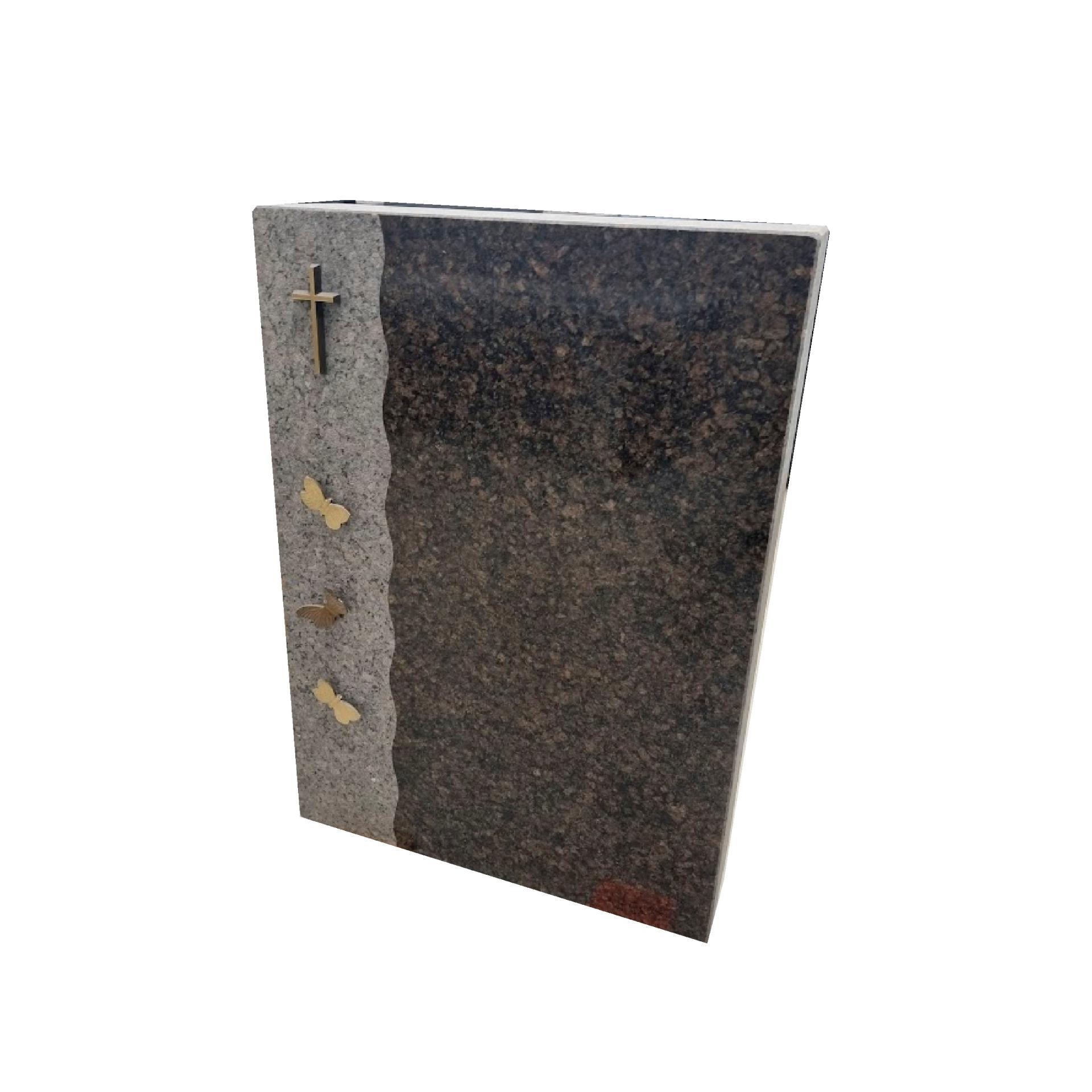 Materiaali: Ruskeaa kiveä, sivut ja tausta sahatut, vasemmalla hiekkapuhallettu reunakoriste, johon kiinnitetty pronssiristi sekä kolme pronssiperhosta