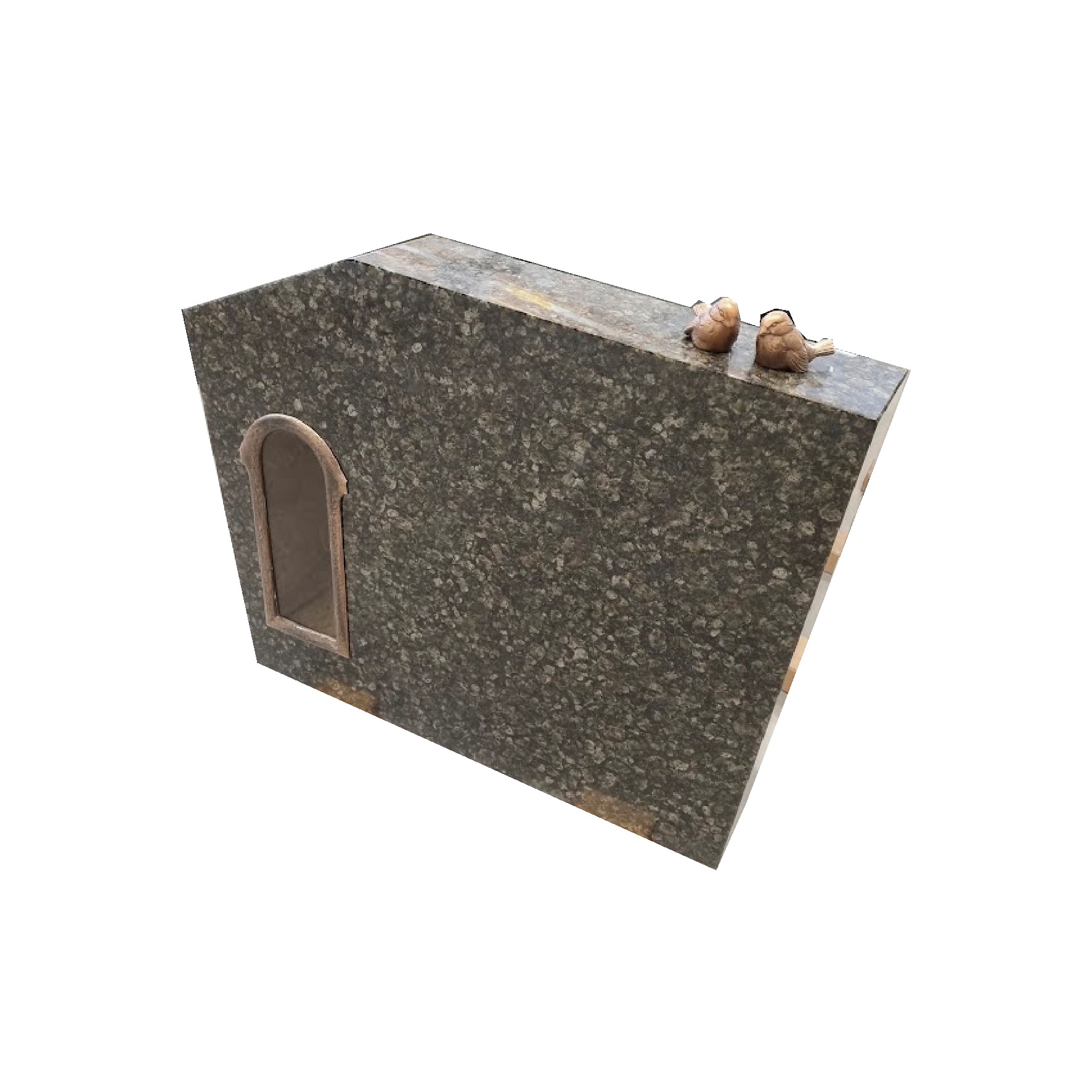 Materiaali: Ylämaan vihreää graniittia, toispuolinen harjakatto, sivut kiillotetut ja tausta sahattu. Holvilyhtyaukko ja taidepatinoidut pronssikehykset. Kaksi taidepatinan sävyistä pronssivarpusta kiven päällä.